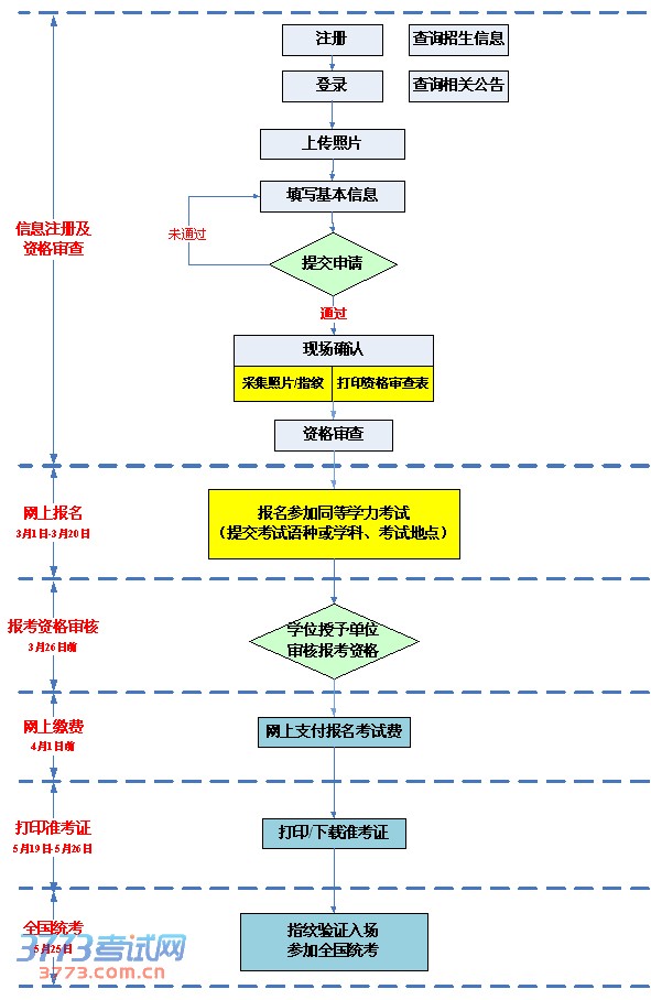 三、网上报名时间:3月1日-20日,逾期不予受理。在报名期间,报考者登录信息平台,提交申请参加考试的语种或学科以及参加考试的地点,考生报名流程见附件1。报考者一般应在接受硕士学位申请的学位授予单位(以下简称“学位授予单位”)所在省市参加考试。如有特殊情况,需申请在工作单位所在省市参加考试的,必须经学位授予单位同意,方可完成报名并参加考试。