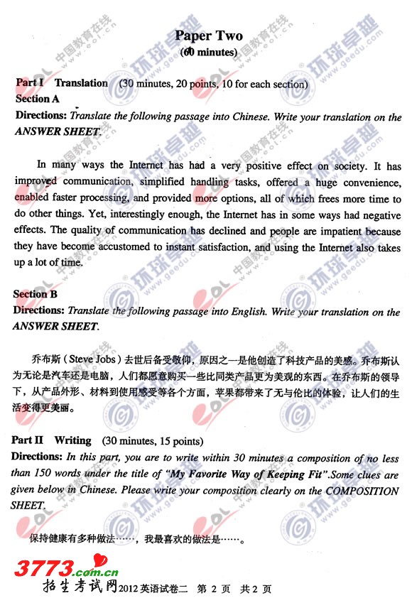 [组图]2012同等学力申硕英语真题(A卷)及答案