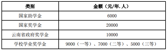 学校提供国家助学金和奖学金(含国家奖学金、云南省政府奖学金、学校学业奖学金),评定标准参照云南财经大学奖助学金管理文件执行,具体奖助学金标准如下: