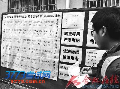 昨天下午3点,记者来到11个研考考点之一的合肥九中,布告栏前早已聚满踩点的考生。“政治在六楼30考场、英语在四楼19考场、专业课在三楼……”不少考生被今年首次实行的“轮流考场”弄得有点晕。