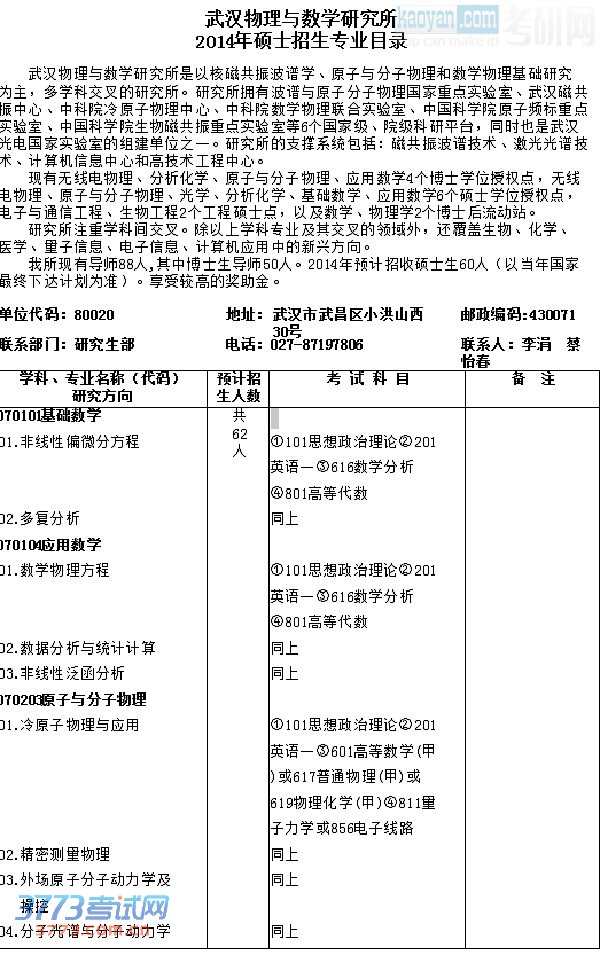[组图]2014中科院武汉物理与数学研究所硕士招生目录