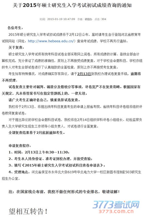 华北电力大学(保定)研究生院昨天早上10点发布通知,该校2015考研初试成绩将于2月12日公布,考生可以登录河北省教育考试院官方网站查询。成绩复查只能在2月13日当天来该校研招办办理,逾期不再受理。以下是通知截图: