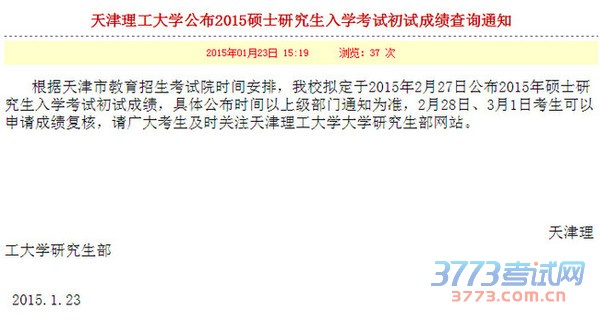 昨天下午三点,天津理工大学研究生部官网发布《天津理工大学公布2015硕士研究生入学考试初试成绩查询通知》。通知表明,该校拟定于2月27日公布2015考研初试成绩。具体时间要以上级部门通知为准。