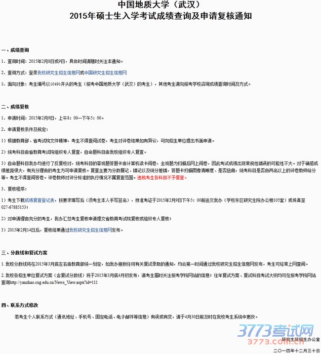 [图文]2015中国地质大学(武汉)考研成绩2.8可查