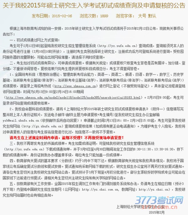 2月6日消息,上海财经大学研究生院官网发布《关于我校2015年硕士研究生入学考试初试成绩查询及申请复核的公告》。公告主要公布了以下几点内容。