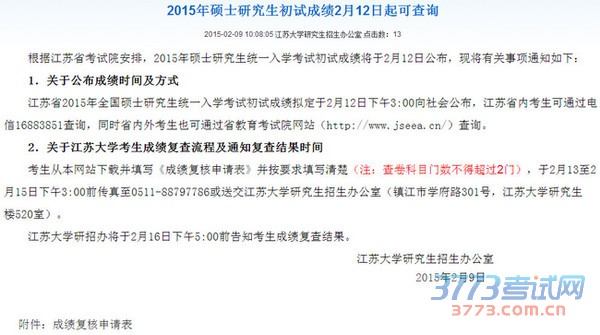江苏大学研究生招生信息网今天早上十点发布一则关于《2015年硕士研究生初试成绩2月12日起可查询》的公告。根据统一安排,江苏大学2015年考研初试成绩将于2月12日下午15点公布。报考江苏大学的考生届时可登录江苏省教育考试院网站查看。另外,还可通过电话查询。