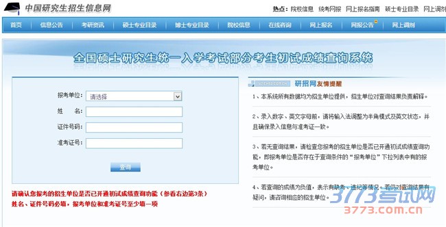 3、若无查询结果,请检查您报考的招生单位是否已开通初试成绩查询功能,即报考单位是否存在于查询条件的“报考单位”下拉列表中有的报考单位。
