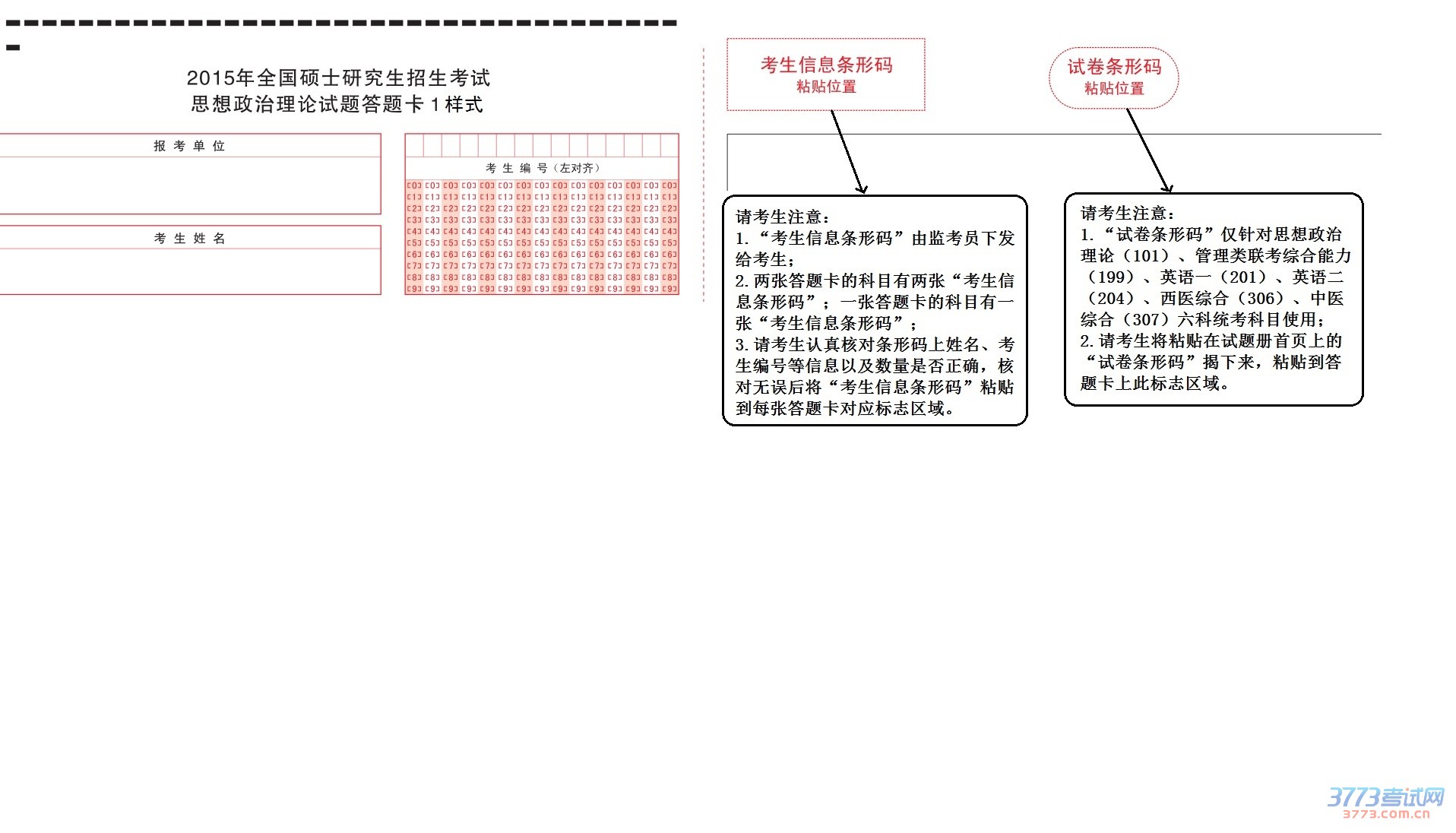 (1)“试卷条形码”仅针对思想政治理论(101)、管理类联考综合能力(199)、英语一(201)、英语二(204)、西医综合(306)、中医综合(307)六科统考科目使用;