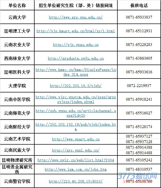 2015年云南省硕士研究生招生单位成绩复核期间联系方式