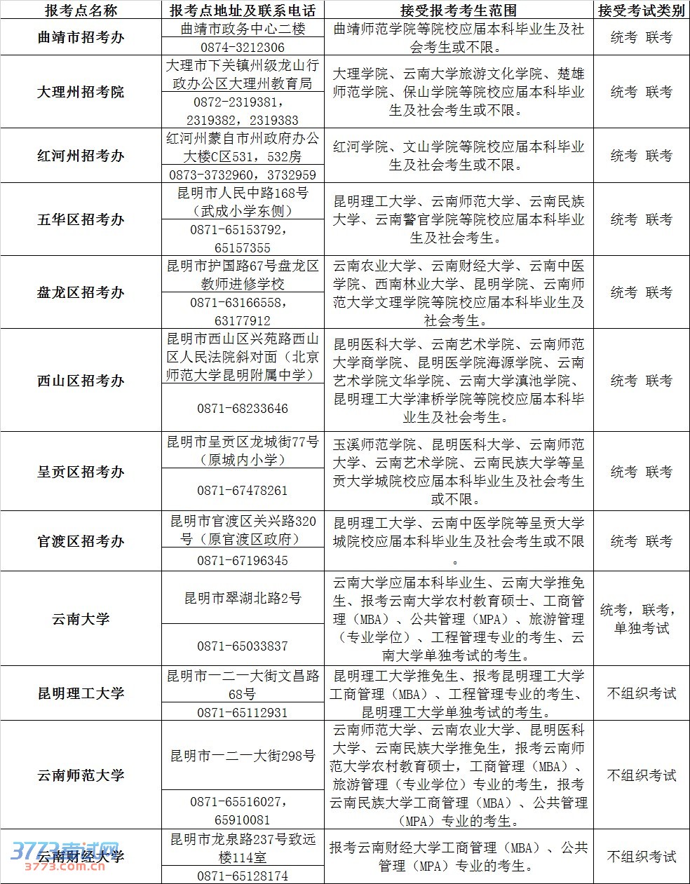 云南省招生考试院指定的报考点进行现场确认网报信息。应届本科毕业生原则上应选择就读学校所在州(市、区)的报考点办理网上报名和现场确认手续;单独考试、推免生及报考工商管理(MBA)、公共管理(MPA)、旅游管理和工程管理等专业学位的考生应选择在报考的院校办理网上报名和现场确认手续;其他考生应选择工作或户口所在地州(市、区)的报考点办理网上报名和现场确认手续。在报名过程中,如遇特殊情况无法在规定报考点报考的考生,可根据实际情况就近报考,各报考点接受报考考生范围及考试类别安排如下: