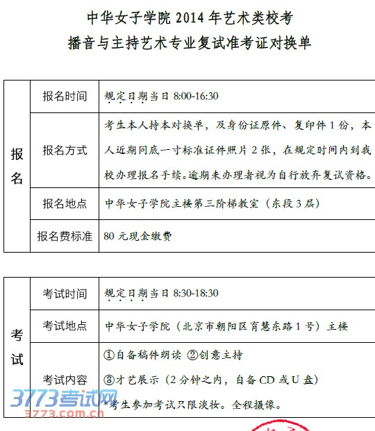 [图文]中华女子学院2014年播音与主持艺术专业复试准考证对换单