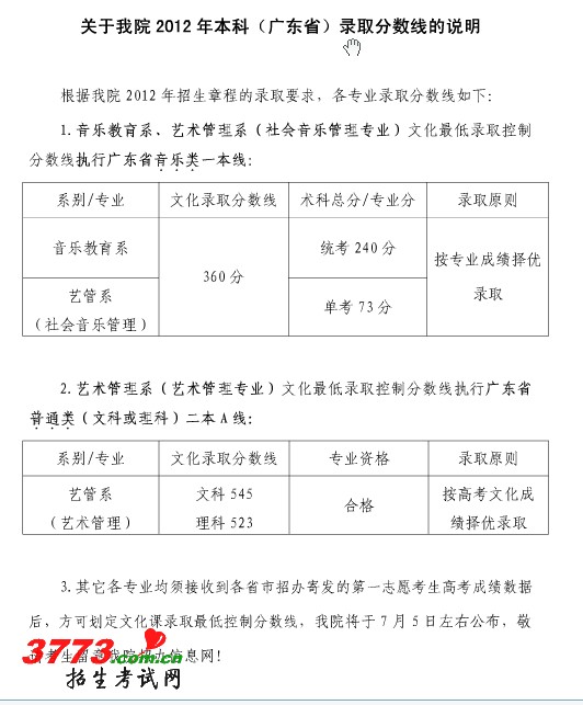 [图文]2012年星海音乐学院广东本科录取分数线的说明