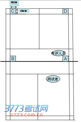 考生站在场地右侧单打底线以外(右手持拍)先进行前后移动,听到口令(同时开表)后,直线上网,单手触网后,直线后退踩底线为完成一个来回,反复进行5次。第5次上网触网后,后退踩底线同时要求双脚出单打边线,并连续做5次左右移动。