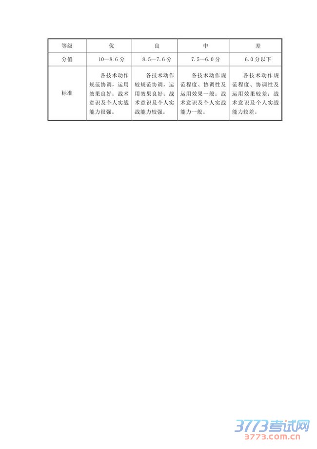 2.评分标准:考员参照实战 评分标准:考员参照实战 评分标准:考员参照实战 评分标准:考员参照实战 评分标准:考员参照实战 评分标准:考员参照实战 评分标准:考员参照实战 评分标准:考员参照实战 能力 评分表 3-4,从动作的正确、 协调连贯程度,技,从动作的正确、 协调连贯程度技,从动作的正确、 协调连贯程度技,从动作的正确、 协调连贯程度技,从动作的正确、 协调连贯程度技,从动作的正确、 协调连贯程度技,从动作的正确、 协调连贯程度技,从动作的正确、 协调连贯程度技,从动作的正确、 协调连贯程度技,从动作的正确、 协调连贯程度技,从动作的正确、 协调连贯程度技,从动作的正确、 协调连贯程度技战术运用水平以及配合意识等方面,独立对考生进行综评定。按 战术运用水平以及配合意识等方面,独立对考生进行综评定。按 战术运用水平以及配合意识等方面,独立对考生进行综评定。按 战术运用水平以及配合意识等方面,独立对考生进行综评定。按 战术运用水平以及配合意识等方面,独立对考生进行综评定。按 战术运用水平以及配合意识等方面,独立对考生进行综评定。按 战术运用水平以及配合意识等方面,独立对考生进行综评定。按 战术运用水平以及配合意识等方面,独立对考生进行综评定。按 战术运用水平以及配合意识等方面,独立对考生进行综评定。按 战术运用水平以及配合意识等方面,独立对考生进行综评定。按 战术运用水平以及配合意识等方面,独立对考生进行综评定。按 战术运用水平以及配合意识等方面,独立对考生进行综评定。按 战术运用水平以及配合意识等方面,独立对考生进行综评定。按 10 分制打,所数 分制打,所数 分制打,所数 分制打,所数 分制打,所数 小数点保留 小数点保留 小数点保留 1位。
