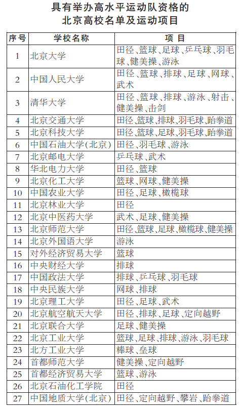 具有举办高水平运动队资格的北京高校名单及运动项目