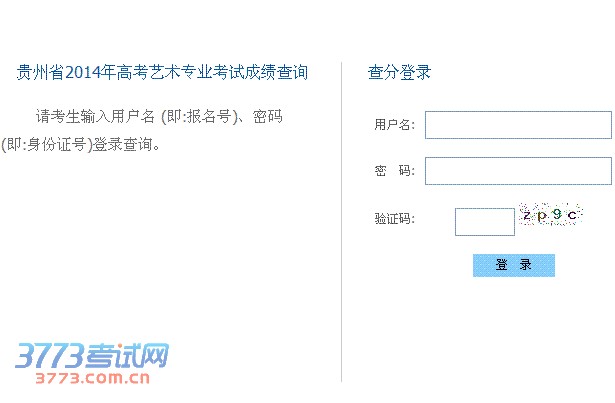 请考生输入用户名 (即:报名号)、密码(即:身份证号)登录查询。贵州省2014年高考艺术专业考试成绩查询