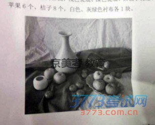 色彩考题:默写,一个白色瓷盘上有两个橘子、一个梨、一块黄布、一块白布、苹果按构图若干个,一个红酒瓶,一个盛红酒的高脚杯。