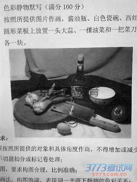 色彩考题:一块白布、一块褐布、酱油瓶、小碗、西红柿一个、菜板、菜刀、油菜蒜、鸡蛋。