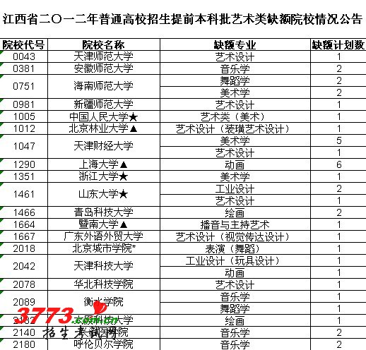大江网讯 记者朱正、实习生王琼报道:7月19日,大江网记者从2012年高招录取现场获悉,今年高招提前批本科艺术类缺额院校具体情况公布。据了解,提前本科批艺术类缺额院校共有72所院校缺额250人,由于提前批体育类院校全部满额,因此不存在缺额填报。