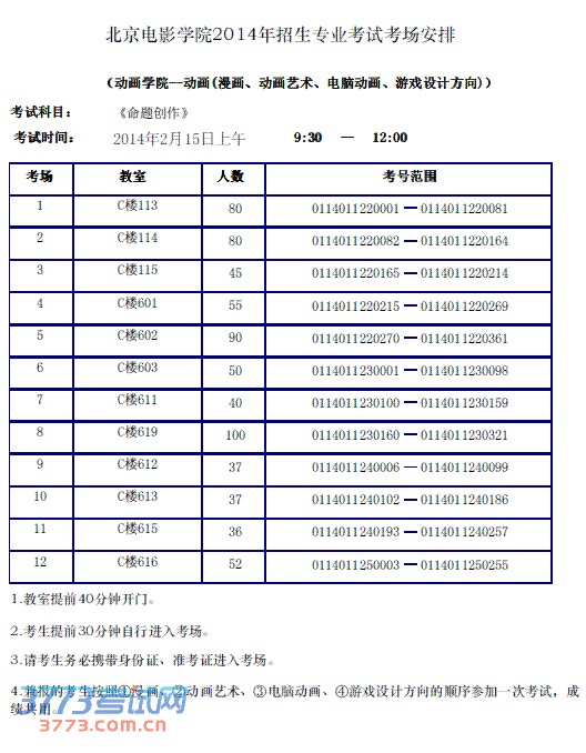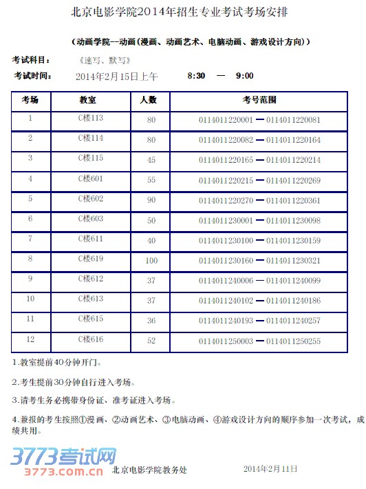 [组图]2014北京电影学院漫画动画艺术电脑动画游戏设计考场安排
