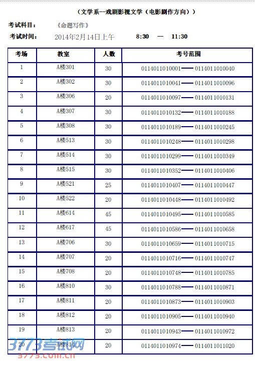 2014年文学系电影剧作方向(复试)考场安排