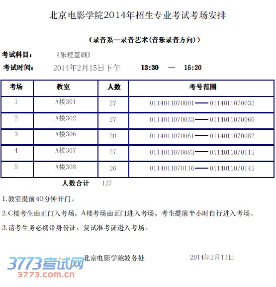 2014北京电影学院音乐录音复试考场安排 音乐录音(复试)考场安排下载