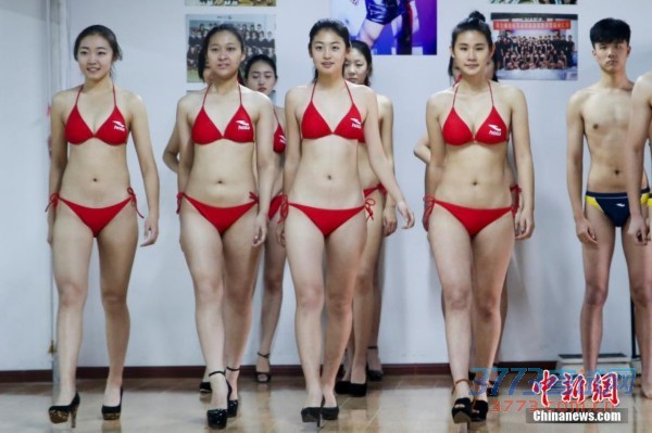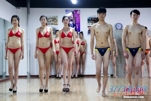 2014年12月8日,山东省青岛市,报考模特专业的艺考生备战2015年艺考上演比基尼秀,帅哥靓女美丽“冻”人。 中新社发 武睿超 摄 图片来源:CNSPHOTO