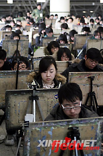 2月20日,“艺考”考生在济南舜耕会展中心展览大厅参加考试。当日,山东省工艺美术学院将考场搬进了2万多平方米的济南市舜耕会展中心,7000多名美术类专业考生在这里参加考试。2008年山东报名参加普通高校艺术招生的人数达到16.1万。 新华社记者 范长国摄