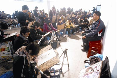 上图:由于考生多,湖北美术学院昨日将展览馆作为大型临时考场