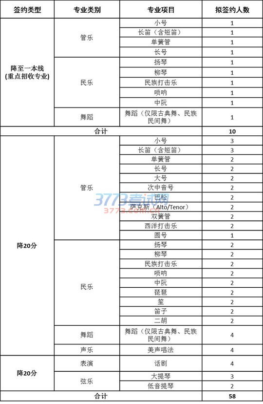 (3)降至一本线录取的优惠资格:符合条件(1)(2),按艺术专业测试成绩从高到低顺次排名,对艺术测试成绩特别优秀的考生给予签约。