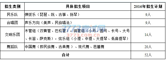 注:我校2017年高水平艺术团招生计划52人,公示入选资格人数按教育部规定执行。以上所列为本年度招生项目,未列出的项目本年度不招生。在招生过程中,我校将坚持择优录取的原则,根据各项目实际生源情况调整拟确定资格人数。招生项目和计划