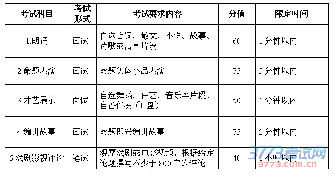 面试,通过抽题确定题目进行编讲故事的创作。基于编、讲两部分的不同侧重点对考生进行考察。编,要求考生对故事的命题理解要准确(不跑题),在理解规定题目的基础上,以生活为依据快速地进行故事情节的组织。考查考生的构思能力,对生活的感悟和理解能力;讲,要求考生把自己构思好的故事以讲述的方式生动地演绎出来。考查考生语言组织、形象思维和舞台表现力。