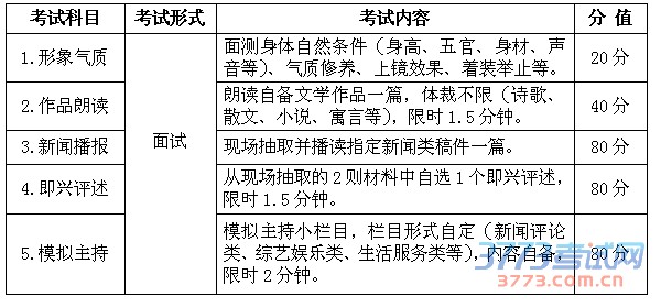 按照广播、电视、网络等电子传媒受众的基本审美标准,综合考察考生的身体自然条件、气质修养、上镜效果、着装举止等情况。