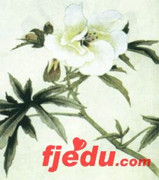 一、白描。淡墨勾花,线条圆润流畅,用线表现花瓣的轻柔。蜀葵的叶子锯齿较多,每处转折时要注意有顿笔动作变化,勾出的线条有力。