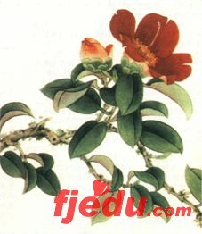 三、曙红晕染花瓣,正面染,反面较淡。绿色罩染叶子正面及花萼深绿色部分。胭脂色提染反面叶子。点苔点加强枝干的粗糙效果,与花叶形成质感上的对比。