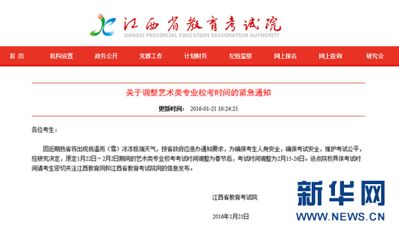 新华网南昌1月21日电(吴亚芬)本网1月21日从江西省教育考试院获悉,因低温雨雪冰冻极端天气影响,江西省教育考试院下发《关于调整艺术类专业校考时间的紧急通知》,艺术类专业校考考试时间调整为春节后。