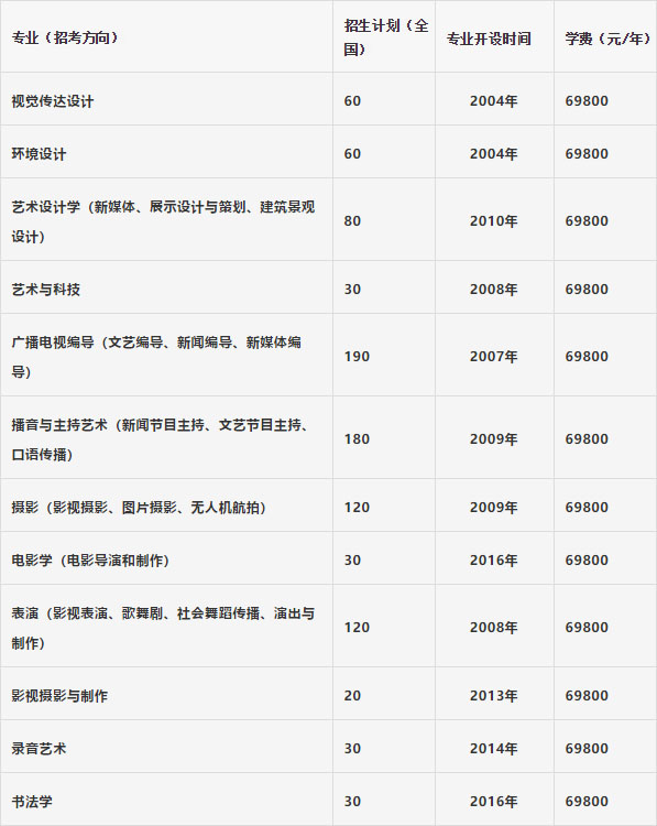 5、学校自行组织专业测试省份的艺术与科技、广播电视编导、播音与主持艺术、摄影、电影学、录音艺术、表演、书法学、影视摄影与制作等专业及专业方向,使用我校校考成绩录取。
