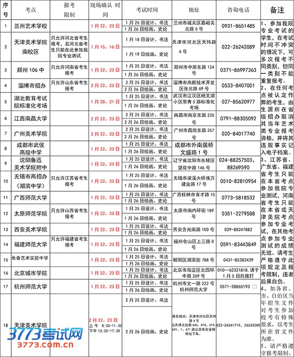 答:河北省考生只能在天津美院南校区考点参加考试,考试时间为1月18、19日,另郑州、太原、淄博、无锡、福建考点只接收本省市的考生,外省考生不能到这些考点参加考试外,其他考点不限制。另外按照江苏、福建、广东省招办规定,江苏省考生只能在无锡考点参加考试,福建省考生只能在福州考点参加考试,广东省考生只能在广州考点参加考试,其他省市暂无此限制(请考生严格遵守此项规定,违者后果自负,并请随时关注本省文件规定,如有特殊规定,按本省规定执行)。