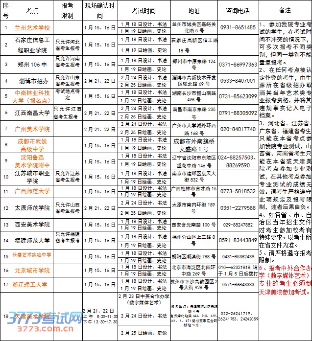 天津美术学院2014年艺术类考点报名考试时间 考点安排: