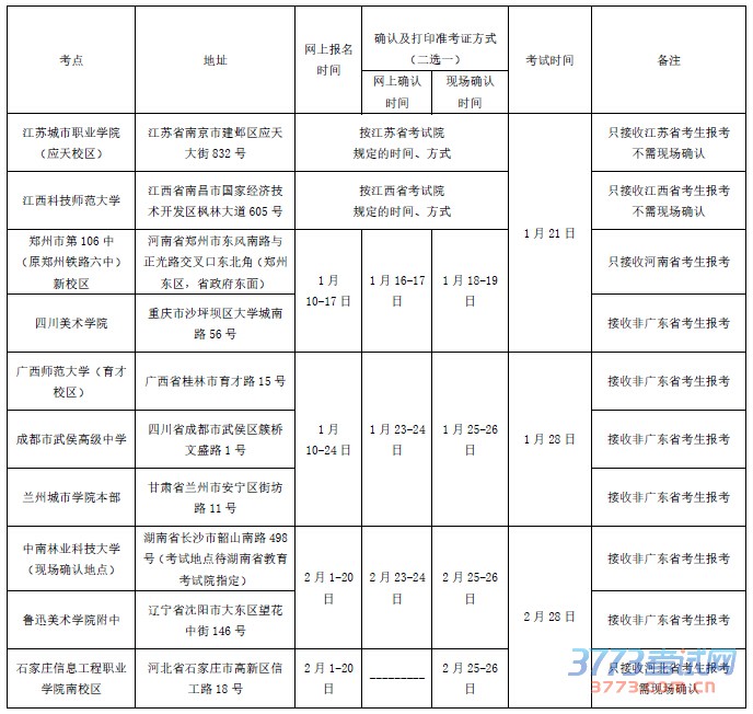 1、各美术类校考专业(除美术学)广东省外考点安排: