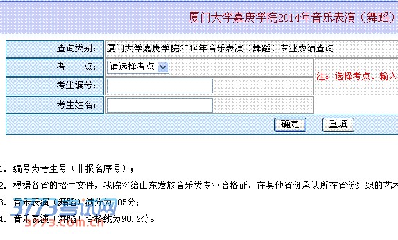查询类别: 厦门大学嘉庚学院2014年音乐表演(舞蹈)专业成绩查询