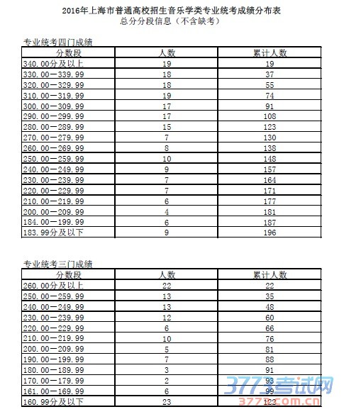 附:2016年上海市普通高校音乐学类专业统考成绩分布表