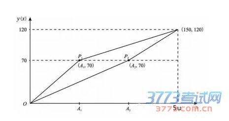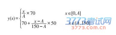 举例来说,设两个科目的合格分数线分别为 A1和 A2,则转换分 y(x) 关于原始成绩x的函数图像,如下图所示: