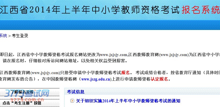 特别提示:江西教师教育网(www.jxjsjy.com)只接受申请中小学教师资格考试报名。 考试成绩合格者,按省教育厅通知(具体时间见江西教育网和江西教师教育网发布的公告),在中国教师资格网(www.jszg.edu.cn)上进行申请教师资格认定报名。