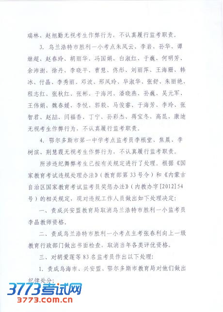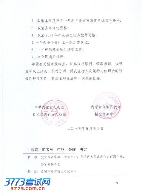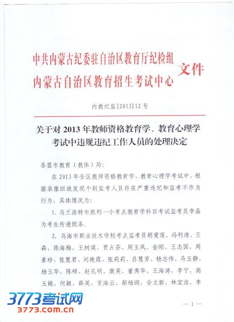 [组图]2013内蒙古教师资格两学考试违规处理决定