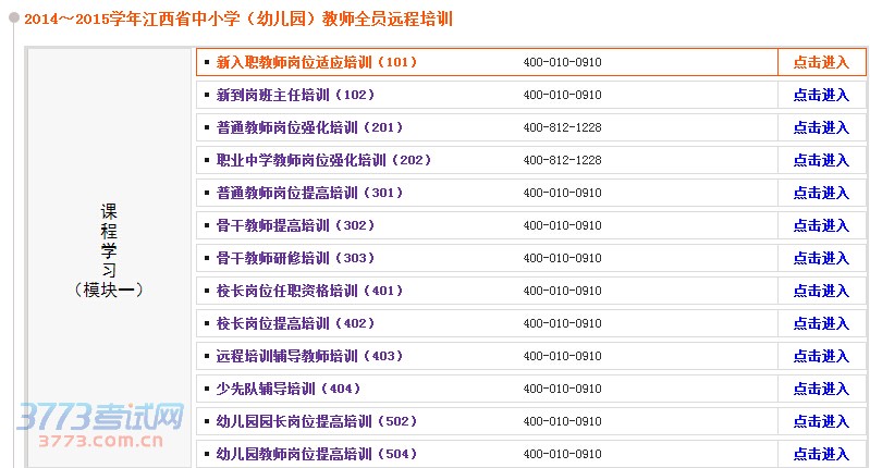 3.进入之后找到以下培训项目,然后根据自己情况,单击后面的“点击进入”开始学习,还有技术问题不懂具体详询可以咨询培训项目后面的咨询电话