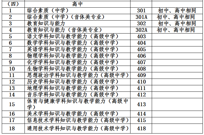 2.高级中学、中等职业学校文化课的学科知识与教学能力科目为:语文、数学、英语、物理、化学、生物、思想政治、历史、地理、音乐、体育与健康、美术、信息技术、通用技术等14个学科。