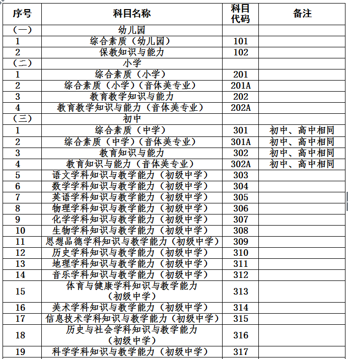 注:1.初级中学学科知识与教学能力科目为:语文、数学、英语、物理、化学、生物、思想品德、历史、地理、音乐、体育与健康、美术、信息技术、历史与社会、科学等15个学科。