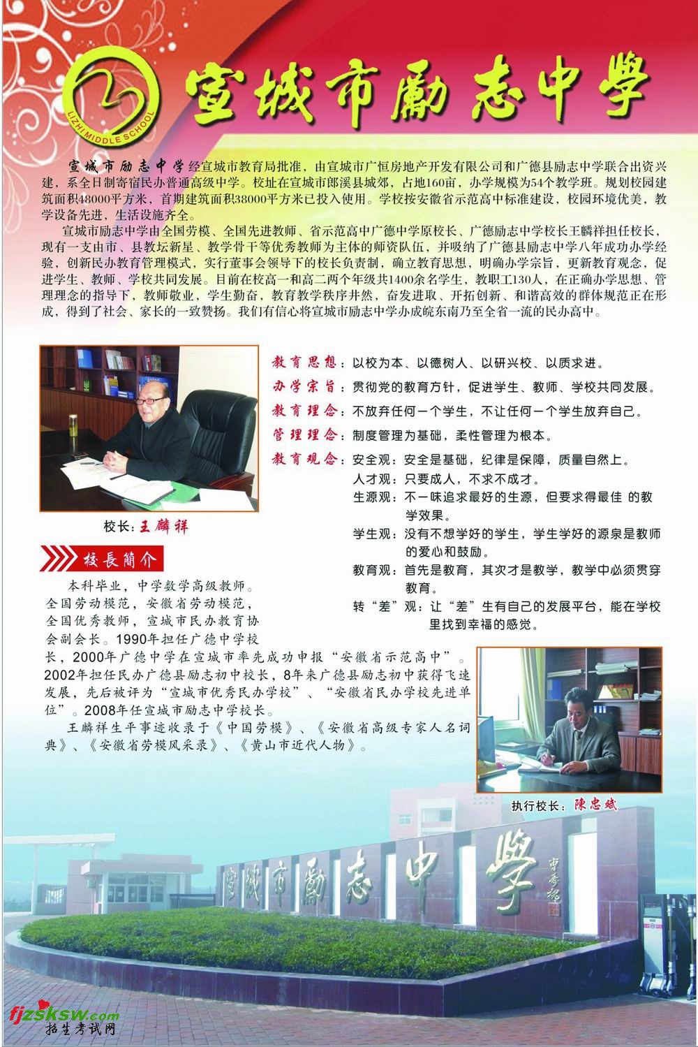 宣城市励志中学由全国劳模、全国先进教师、省示范高中广德中学原校长王麟祥担任校长,现有一支由市、县教坛新星、教学骨干等优秀教师为主体的师资队伍,并吸纳了广德县励志中学八年成功办学经验,创新民办教育管理模式,实行董事会领导下的校长负责制,确立教育思想,明确办学宗旨,更新教育观念,促进学生、教师、学校共同发展。目前在校高一和高二两个年级共1400余名学生,教职工130人,在正确办学思想、管理理念的指导下,教师敬业,学生勤奋,教育教学秩序井然,奋发进取、开拓创新、和谐高效的群体规范正在形成,得到了社会、家长的一致赞扬。我们将把宣城市励志中学办成皖东南乃至全省一流的民办高中。
