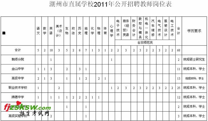 附:潮州市直属学校2011年公开招聘教师岗位表